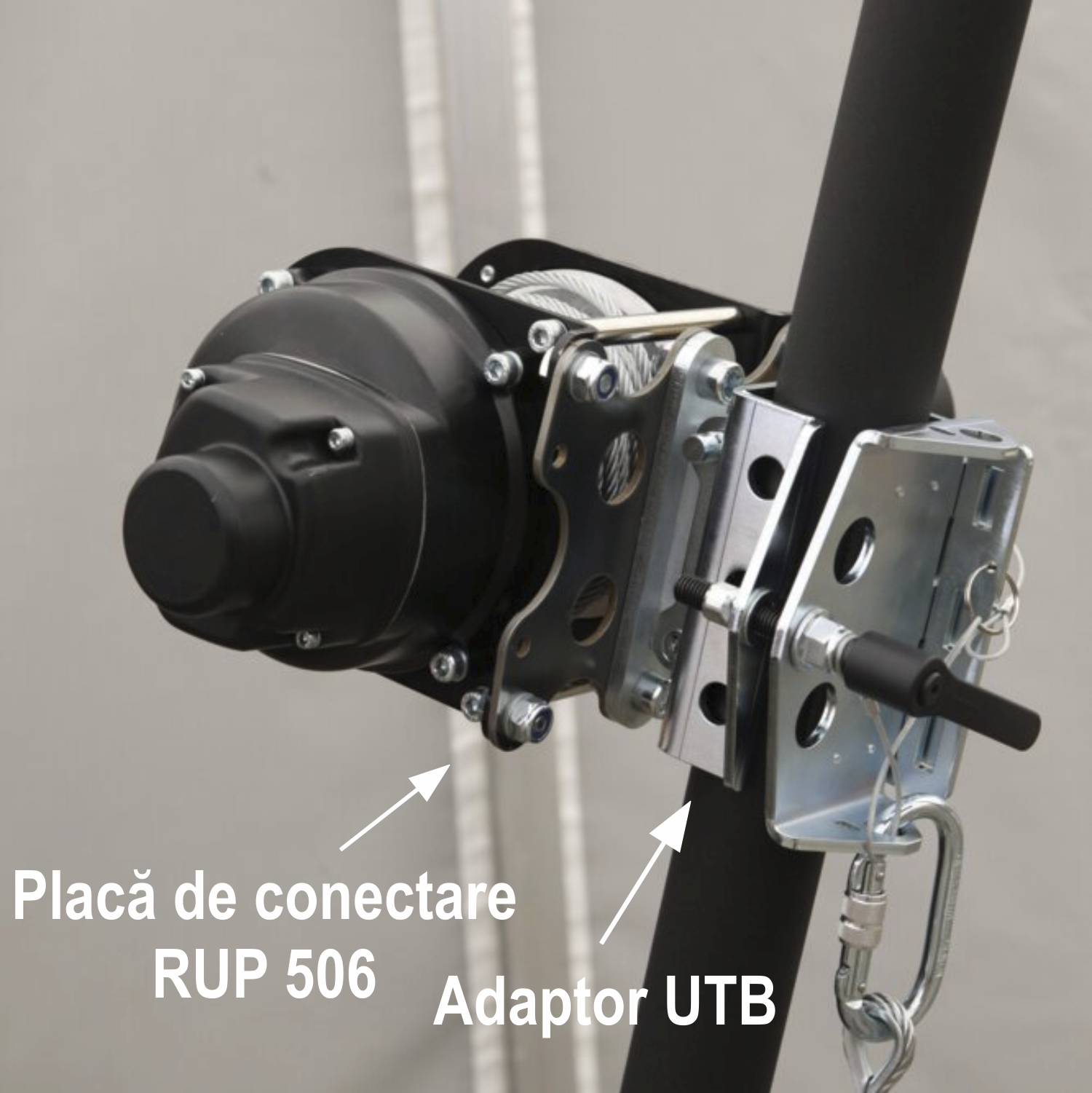 Dispozitivul se fixează simplu, pe unul din picioarele trepiedului TM9-N, prin intermediul adaptorului UTB și a plăcii de conectare RUP 506, după care se poate realiza prin acționarea electrică a cablului de ancorare (realizat din oţel galvanizat, de formă toronată cu diametru de 6 mm).