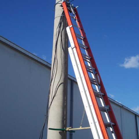 Pentru a putea fi utilizate la lucrări pe stâlpi, scările pot fi echipate (la cerere) cu dispozitiv detașabil de ancorare şi fixare, tip cleşte care permite ancorarea scării de stâlp şi asigurarea lucrătorului împotriva căderii (pe timpul urcării / lucrului / coborârii).